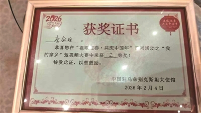 2月4日晚,中國(guó)駐烏茲別克斯坦使館舉行2026年新春招待會(huì),現(xiàn)場(chǎng)500多位華僑華人和中資企業(yè)代表出席,規(guī)格隆重。當(dāng)天還揭曉了中國(guó)駐烏茲別克斯坦使館舉辦的“我的家鄉(xiāng)”短視頻大賽獲獎(jiǎng)作品名單,南岳能人志士、烏茲別克斯坦浙江商會(huì)常務(wù)副會(huì)長(zhǎng)李金旺攜原生態(tài)南岳宣傳片脫穎而出,榮獲三等獎(jiǎng),作品在現(xiàn)場(chǎng)展播,讓南岳的港鎮(zhèn)融合、漁家煙火與非遺民俗在國(guó)際舞臺(tái)精彩亮相。